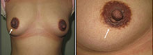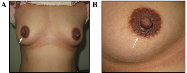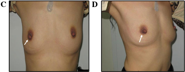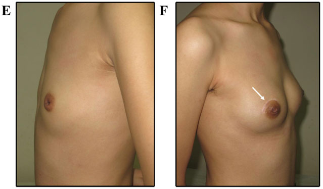 Фотографии (A и B) через 2 года после удаления фиброаденомы. (C и D) фотографии через 6 месяцев после удаления доли молочной железы. Фотографии пациентки (E и F) через 6 месяцев после удаления фиброаденомы.