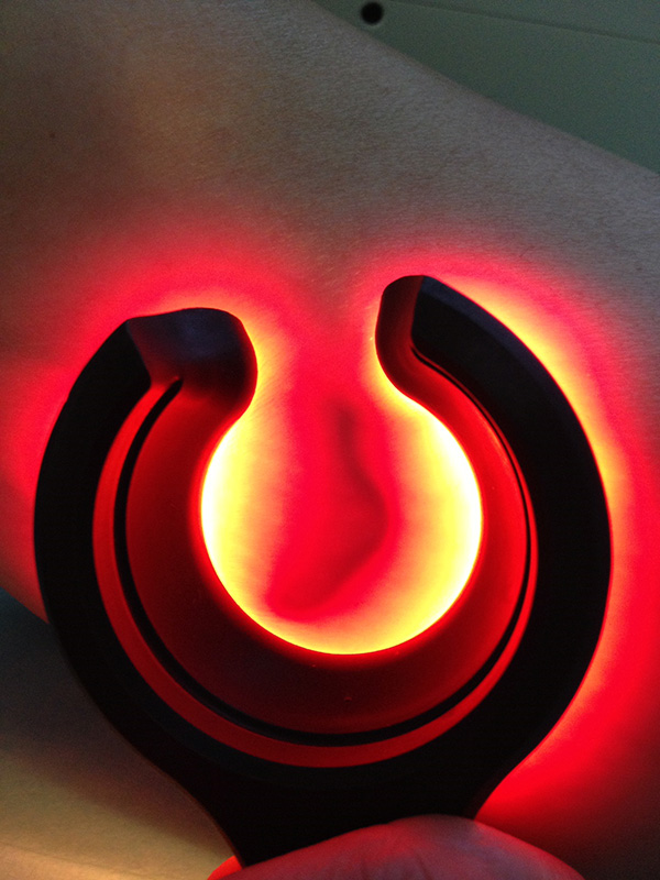 Еще для дополнительной визуализации мы используем прибор “Veinlite”. Он необходим для обнаружения расширенных внутрикожных и подкожных вен, питающих сосудистые звездочки. Это устройство помогает нам, делает процесс лечения (склеротерапии) более удобным и улучшает результаты.